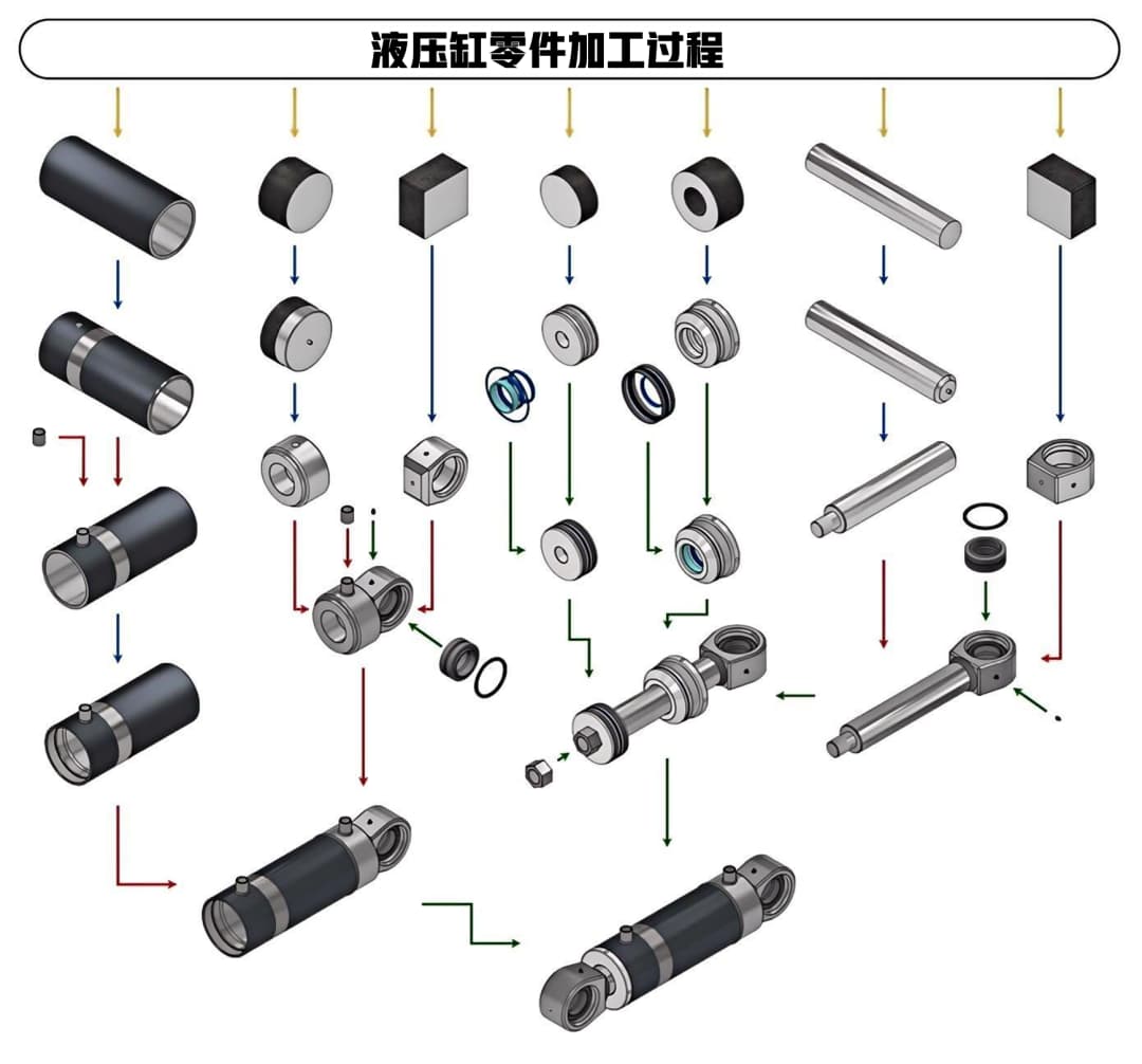 The manufacturing process of a single-rod double-acting hydraulic cylinder can be summarized into five main stages: "Raw Material Pre-treatment → Core Component Maching → Welding → Assembly → Testing". Each step requires strict control of process parameters (such as cutting speed and feed rate) to avoid common defects (such as hole misalignment and part deformation):